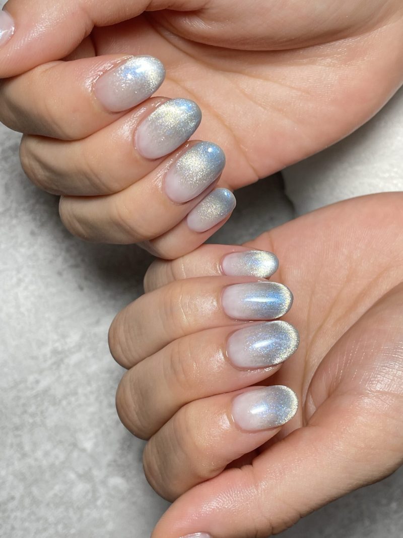 私の激推し!な肌馴染み抜群のチークベージュに水色マグネットグラデーションにダズルフィルムフレークでキラキラに✨マグネットグラデーションはフレンチになるように輝かせています♪