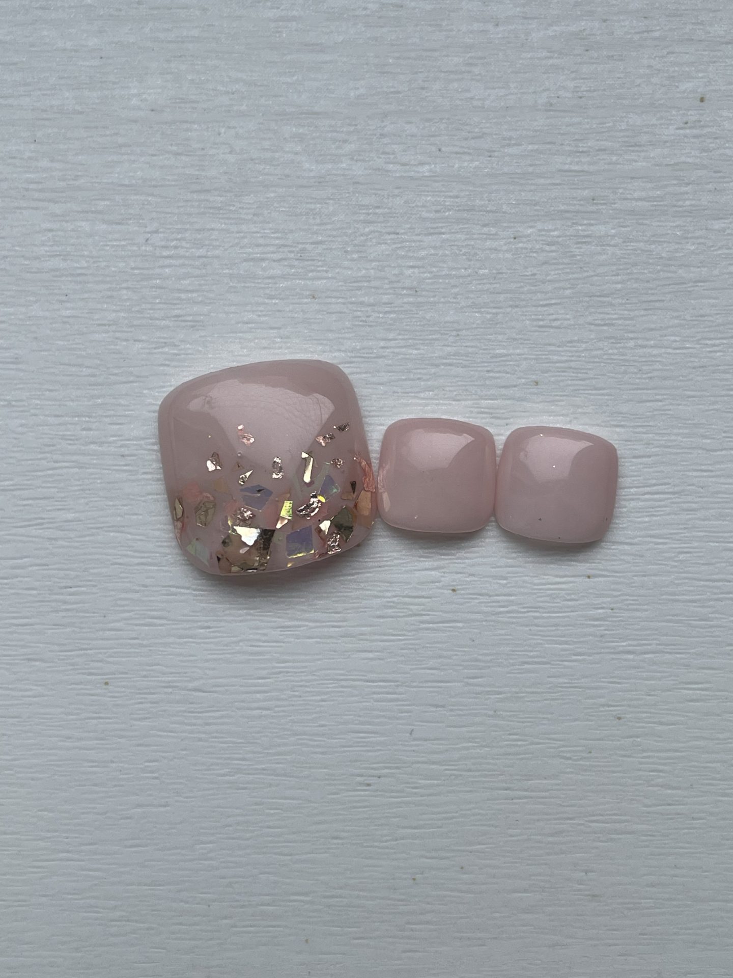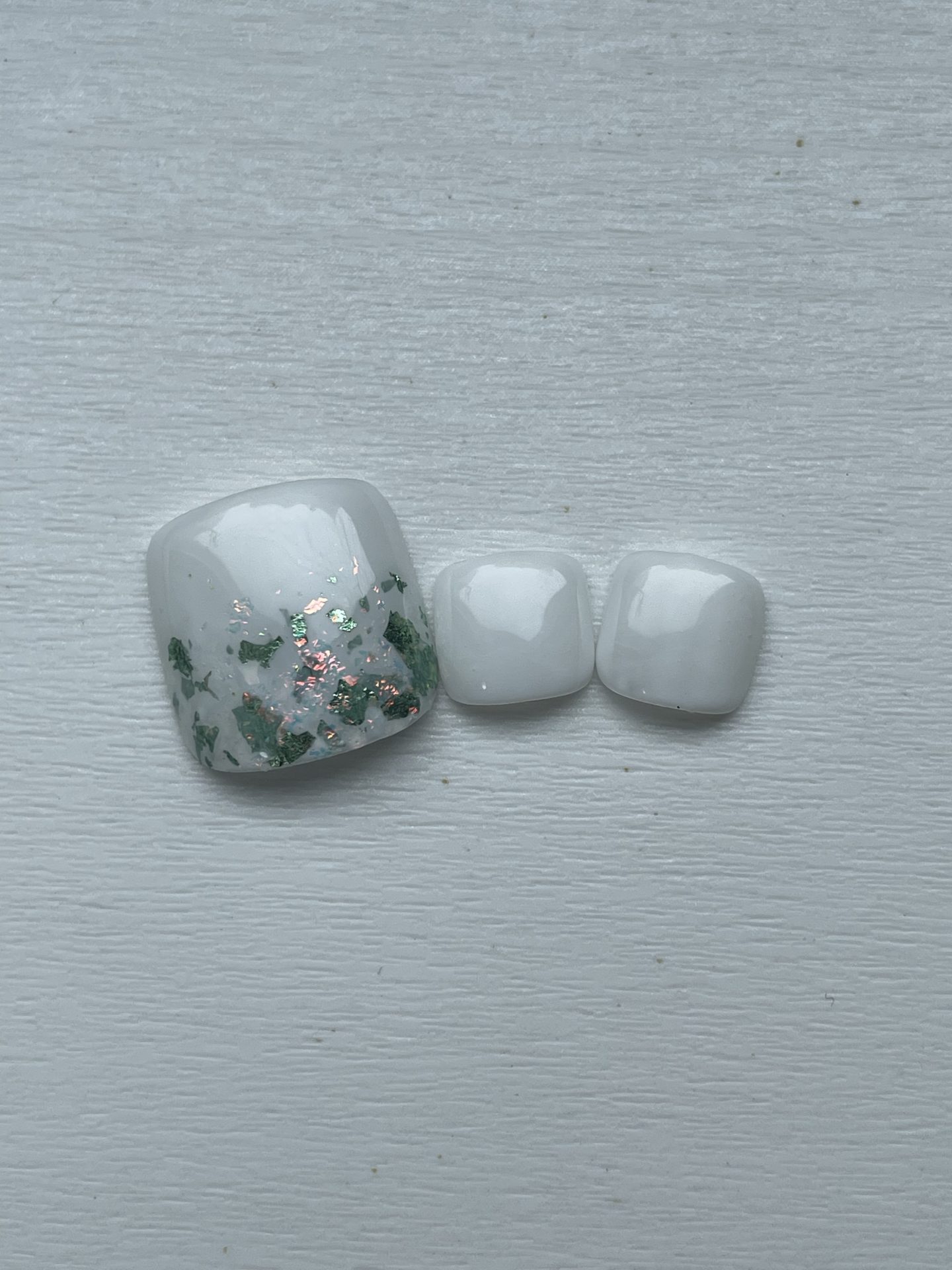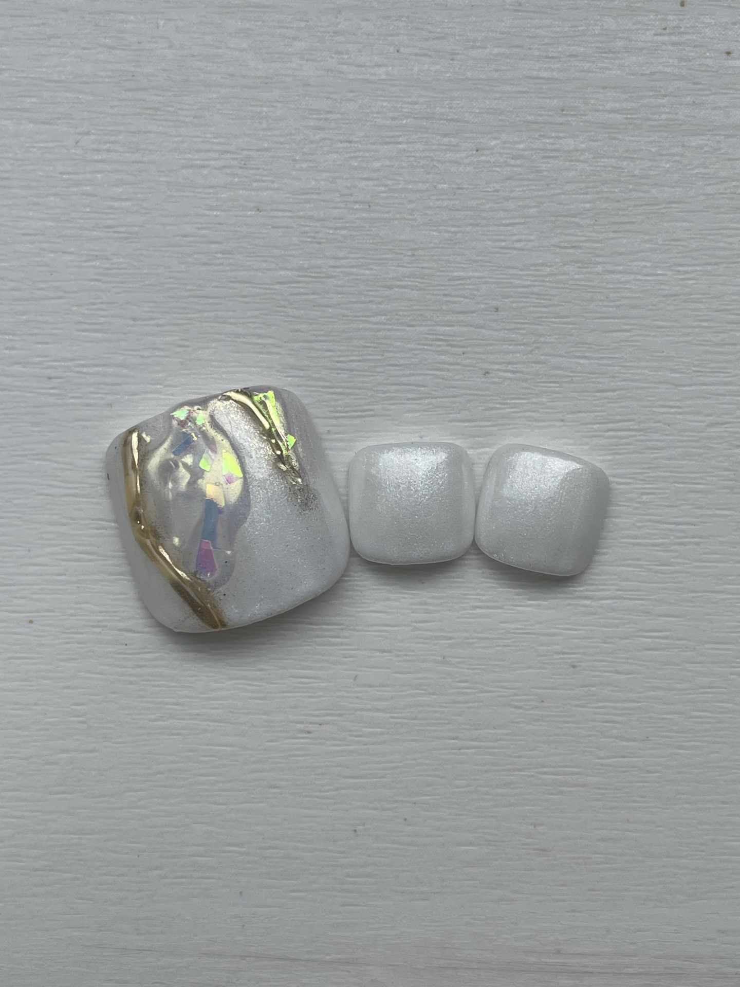 パールホワイトをベースカラーにオーロラのぷっくりニュアンスに乱切りのオーロラホロ、ゴールドのニュアンスも入れてトキメク足元に。