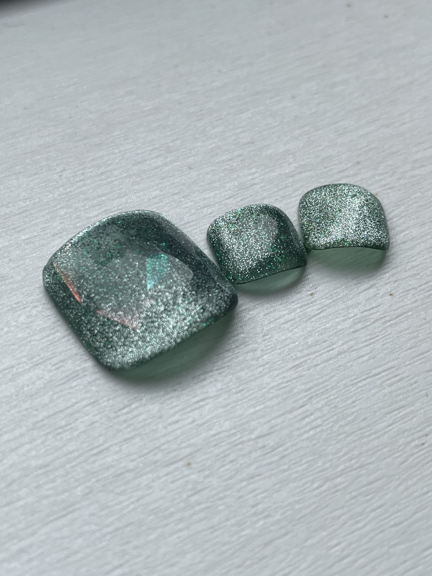 マグネットパウダーをベースにオーロラフィルムを挟み込みグリーンに光るオーロラパウダーで仕上げました。角度を変えて楽しめるデザインです。